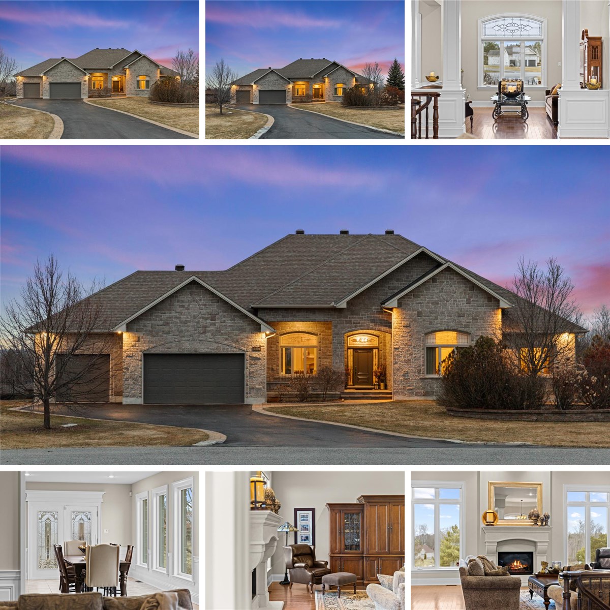 Extraordinary bungalow in prestigious Cumberland Estates, cul-de-sac pie-shaped 2.36-acre lot w/elevated rear view, stone exterior, interlock landscaping, exterior pot lighting & front veranda, foyer w/oversized heated tile, millwork & 12-ft ceilings, open dining rm w/built-in cabinet, living rm w/custom hearth fireplace, hardwood flooring & pot lights, centre island kitchen, granite countertops, recessed sink & backsplash, fridge & freezer, separate eating area w/multiple windows & garden doors, 2 pc powder rm & main floor laundry, primary bedroom w/French doors, coffered ceiling, 3 x floor-to-ceiling windows, dressing walk-in closet & luxurious six-piece en-suite w/standalone tub, heated tile flooring/towel rack, glass shower & vanity. Additional bedrooms, wide hardwood Scarlett O'Hara staircase, recreational rm, den, gym, additional bdrms, storage & rough-ins for potential in-law suite w/direct side entrance & 2nd staircase, insulated 3 x garage, 24 Hr irrevocable on all offers.