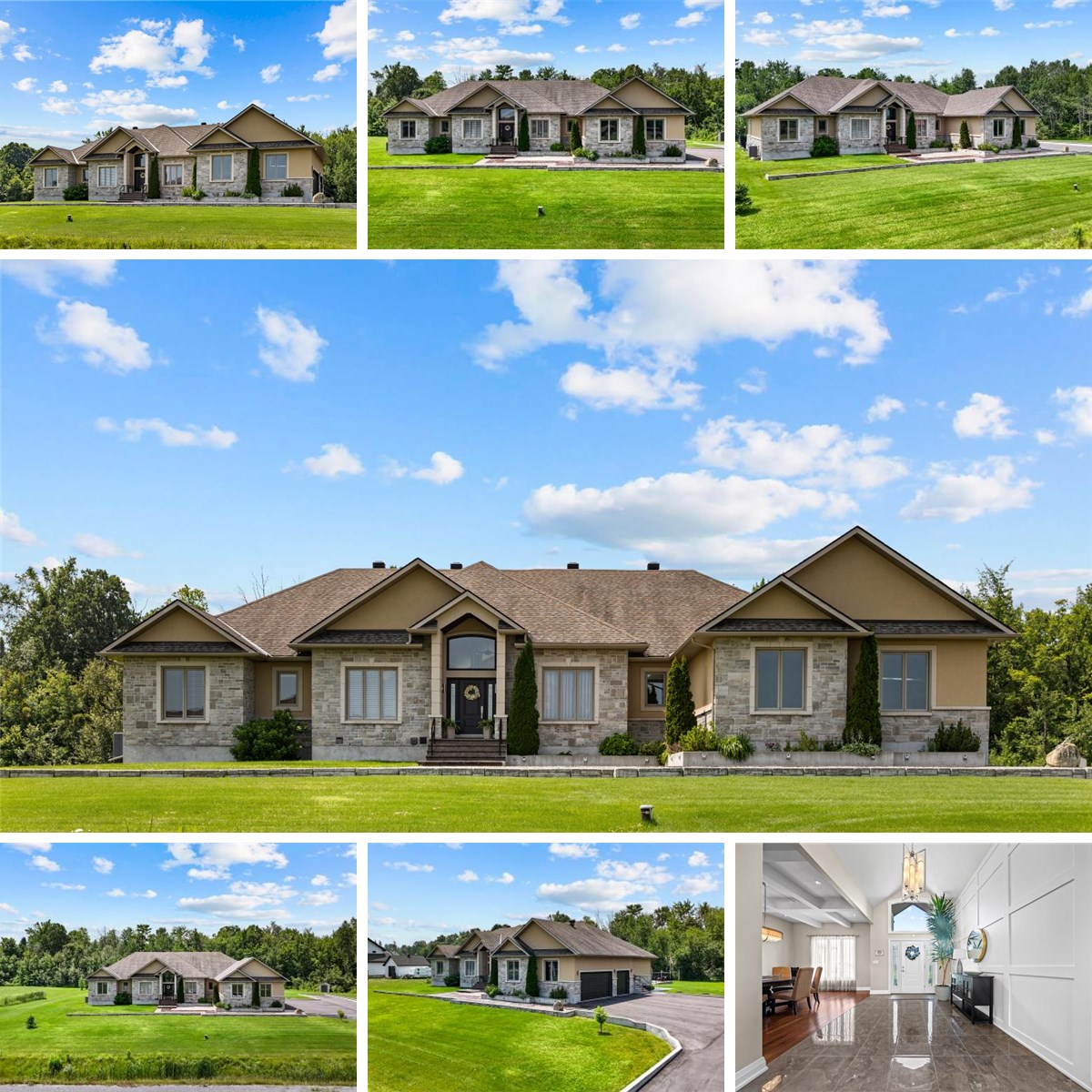 The exterior features a timeless blend of stone and stucco, complemented by a stamped concrete walkway, an interlock front patio, pot lights under the eavestrough, and a paved driveway leading to a spacious triple-car garage.