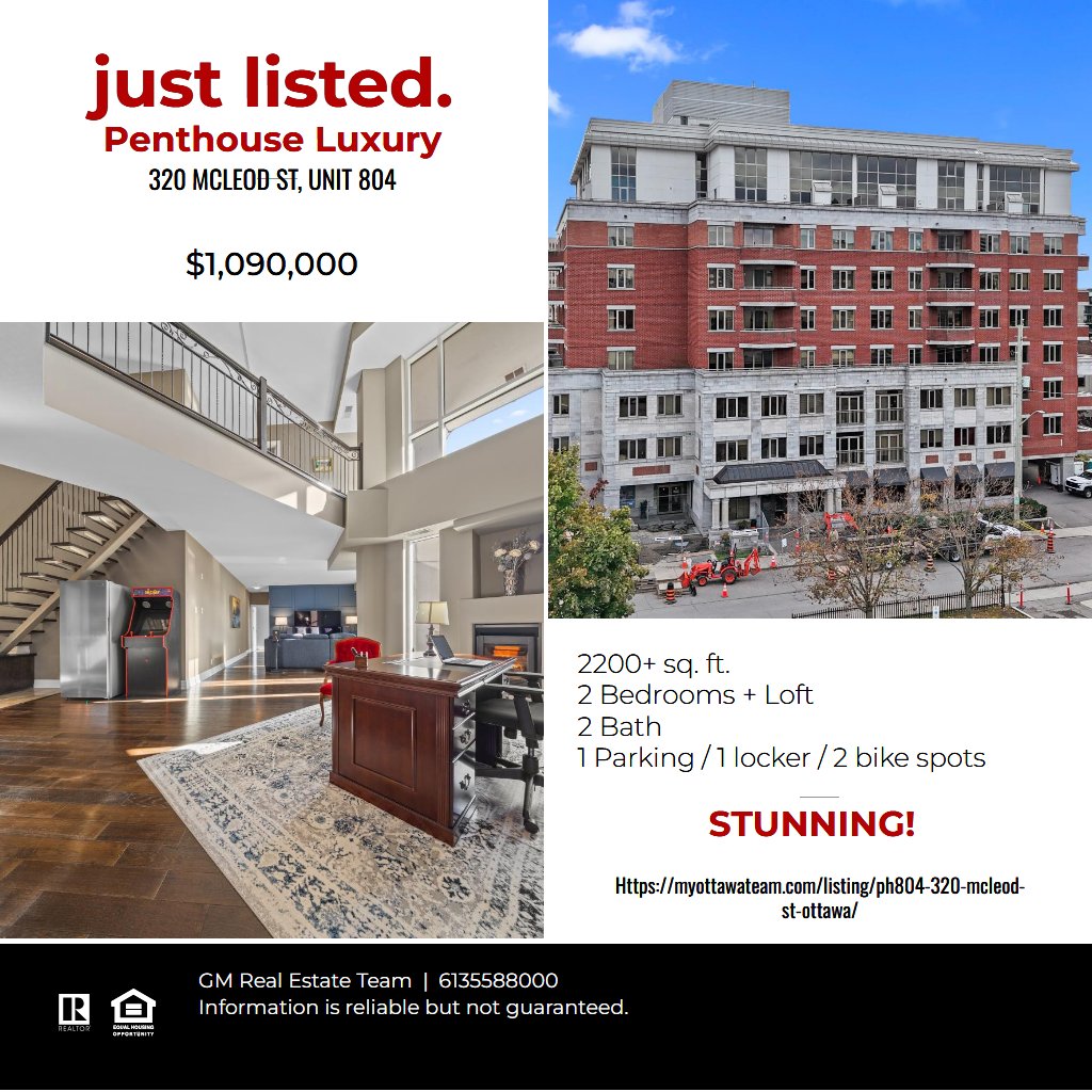 Welcome to the Penthouse at The Opus - where exceptional square footage meets sophisticated downtown living. Square footage of this scale is nearly impossible to find in today's condo market! This rare offering has 2250+ sq. ft. of bright, south-facing living space. The inviting foyer opens to an impressive 2-storey living room with open riser staircase, ornamental ironwork, and floor-to-ceiling windows drawing in natural light. The open-concept kitchen features off-white cabinetry, granite counters with bar seating, excellent prep space, and clear sightlines to the living and dining areas. The dining room comfortably fits 6-10 guests, ideal for entertaining. The current living room (used as one of two home offices) includes a gas fireplace and access to a private balcony overlooking the gardens and rooftops. A second large flexible room on the main level can function as a family room, closed den, or optional 3rd bedroom. A generous secondary bedroom and full 4-piece bathroom complete this floor. Upstairs, the loft awaits, offering the best views in the home - perfect as a home office, studio, gym, or creative space. Laundry and utility rooms are conveniently located off this level. The Primary Suite includes a walk-in closet and a spacious 5-piece ensuite with soaker tub and double-sided fireplace shared with the bedroom. Ample room for a king-sized set. The unit includes one underground parking space, one locker, and two bicycle spots. Building amenities include a fitness room, party room with kitchen, library, guest suite, and five visitor parking spots. Exceptional location: seconds to the 417, two blocks from the Rideau Canal, and walking distance to both downtown and the Glebe. Urban convenience and executive elegance come together in this rare offering at The Opus. A penthouse offering true space, natural light, and flexibility - this is downtown living without compromise.