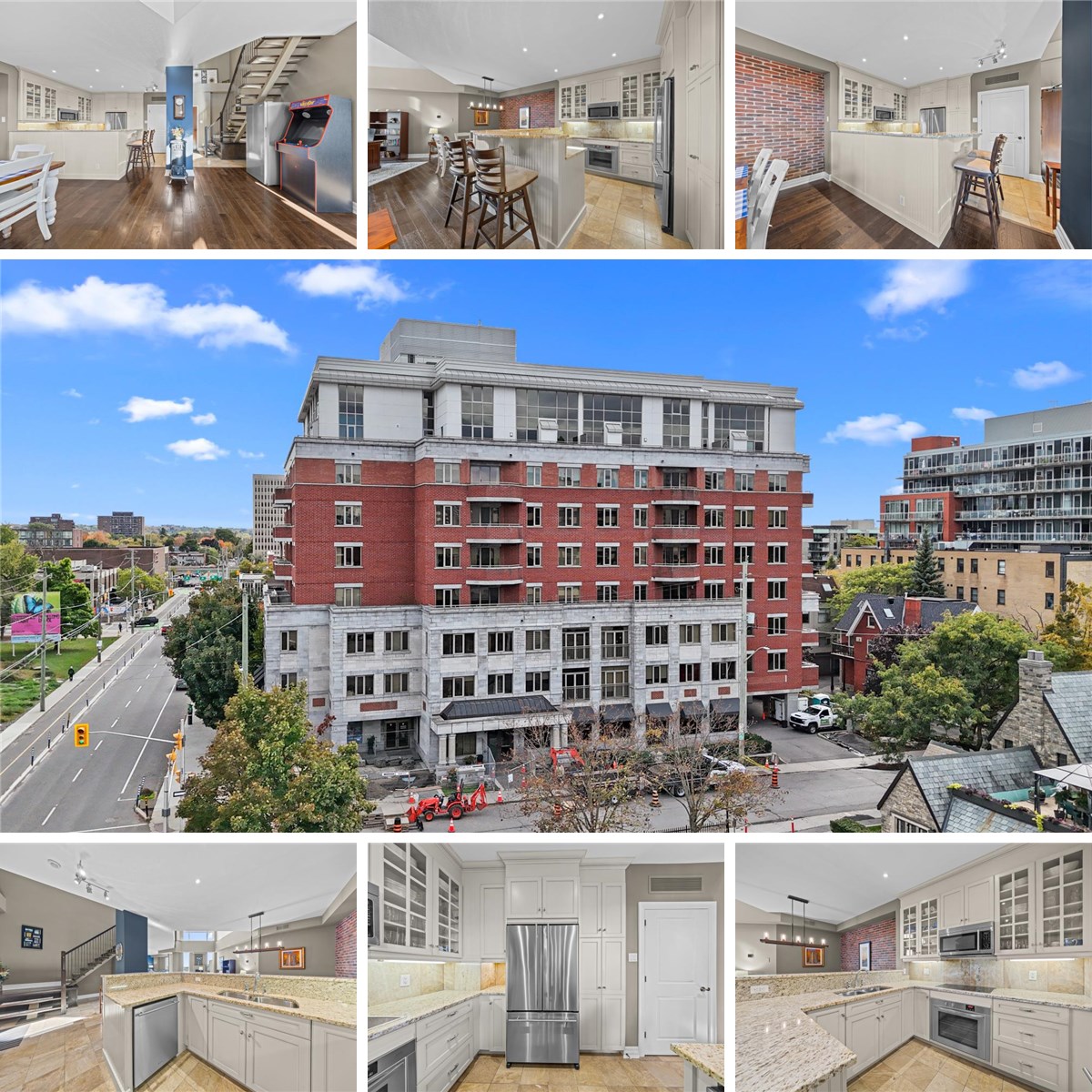 Welcome to the Penthouse at The Opus - where exceptional square footage meets sophisticated downtown living. Square footage of this scale is nearly impossible to find in today's condo market! This rare offering has 2250+ sq. ft. of bright, south-facing living space. The inviting foyer opens to an impressive 2-storey living room with open riser staircase, ornamental ironwork, and floor-to-ceiling windows drawing in natural light. The open-concept kitchen features off-white cabinetry, granite counters with bar seating, excellent prep space, and clear sightlines to the living and dining areas. The dining room comfortably fits 6-10 guests, ideal for entertaining. The current living room (used as one of two home offices) includes a gas fireplace and access to a private balcony overlooking the gardens and rooftops. A second large flexible room on the main level can function as a family room, closed den, or optional 3rd bedroom. A generous secondary bedroom and full 4-piece bathroom complete this floor. Upstairs, the loft awaits, offering the best views in the home - perfect as a home office, studio, gym, or creative space. Laundry and utility rooms are conveniently located off this level. The Primary Suite includes a walk-in closet and a spacious 5-piece ensuite with soaker tub and double-sided fireplace shared with the bedroom. Ample room for a king-sized set. The unit includes one underground parking space, one locker, and two bicycle spots. Building amenities include a fitness room, party room with kitchen, library, guest suite, and five visitor parking spots. Exceptional location: seconds to the 417, two blocks from the Rideau Canal, and walking distance to both downtown and the Glebe. Urban convenience and executive elegance come together in this rare offering at The Opus. A penthouse offering true space, natural light, and flexibility - this is downtown living without compromise.